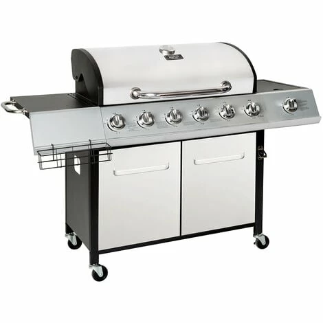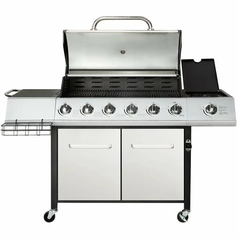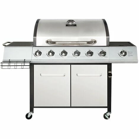 Perfect for accommodating large family feasts, this highly versatile and powerful premium gas barbecue is ideal for any sized garden. The 6 x individually ignitable gas burners mean that you can create a variety of temperature zones across the grill and cook a wide range of foods, all at the same time.Featuring a large cooking area, there’s also an additional side burner which can be easily ignited and controlled. Set with a full-length warming rack, there’s also a handy thermometer in the hood, to easily monitor cooking temperature. The double-layered hood provides added insulation and can keep food warm for up to 30 minutes after the barbecue has been turned off.For added convenience, there’s a side table for food preparation and a removable drip tray for easy cleaning. Complete with additional storage space, there are a lower double storage cupboard, three utensil hooks and even a sauce rack for your favourite sauces. Finished with four castor wheels, side handle and brakes, the gas barbecue can be easily manoeuvred around the garden or patio.Designed with a heat and flame resistant paint, this high-quality barbecue will last for many years to come. This sleek gas barbecue will look stylish in any outdoor living space and is easy to store away.