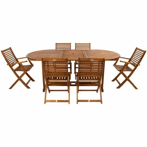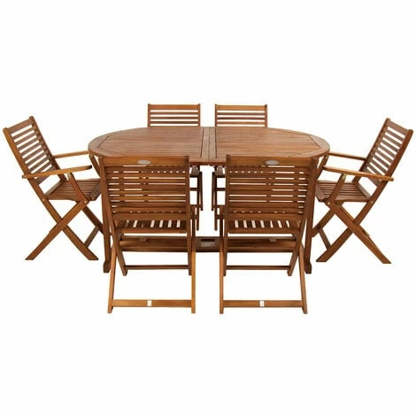 This 7 Pc Hardwood furniture set is perfect for the garden and patio area. This attractive oval extendable table and chairs furniture set is ideal for dining and entertaining outdoors during the summer. It is made from Hardwood and is designed to provide a marvellous dining experience. It includes 4 wooden folding chairs and 2 armchairs for easy storage. It is recommended that the set is covered out of season.