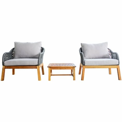Enhance your outdoor space with this stunning Charles Bentley Bistro Set. A perfect set for two people to enjoy a cosy cup of tea or celebrate with a glass of bubbly. Comprising of a square Acacia wood coffee table complete with 2 beautiful mixed material arm chairs, the set makes a sophisticated statement for you garden, patio, conservatory or living area. The design is contemporary, eye catching and practical. The hard wearing Acacia table top should ensure years of use. The solid acacia wood frames and legs have a light modern feel which beautifully complements the string rope pattern finish. Sturdy and waterproof, this set is suitable for both indoor and outdoor use. Perfect for sitting back and relaxing in the comfort of your own garden or living space.