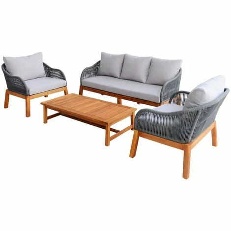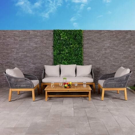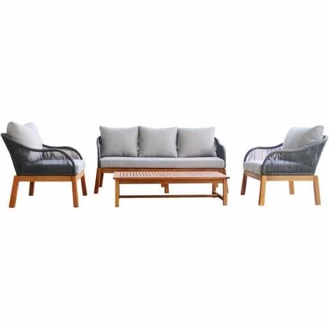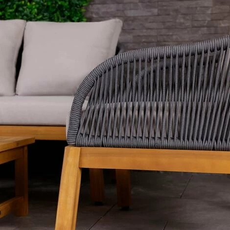 Enhance your outdoor space with this stunning Charles Bentley lounge set. A perfect set for up to four people to enjoy a morning coffee or celebrate with a glass of bubbly. Comprising of a rectangular Acacia wood coffee table complete with a mixed material bench and two large armchairs, the set makes a sophisticated statement for you garden, patio, conservatory or living area. The design is contemporary, eye catching and practical. The hard wearing Acacia table top should ensure years of use. The solid acacia wood frames and legs have a light modern feel which beautifully complements the string rope pattern finish. Sturdy and waterproof, this set is suitable for both indoor and outdoor use. Perfect for entertaining in the comfort of your own garden or living space.
