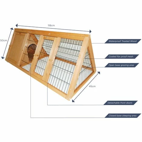 Our single level triangle run has been dipped in a pet friendly wood preserve, and is finished to the highest standards – no rough edges or splinters. Featuring a wooden floor in the sleeping area, your pet will be comfortable in their new home. This hutch comes with completely removable front doors, held in place by a wooden latch, allowing easy access for cleaning. What’s more, this piece is lightweight, allowing you to move around the garden, and keep you animal grazing on fresh grass.