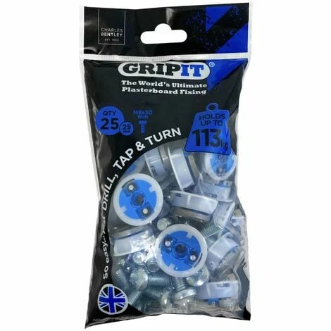 Using their uniquely patented designed slim gripping wings, Gripit Fixings fold out in the gap behind the plasterboard to create one of the most effective and secure fixings on the market today. Ideal for DIY & Trade – hang curtain rails, book shelves and kitchen/bathroom units, to radiators, boilers and wall mounted TV’s.Traditional plasterboard fixings, although initially secure often fail over time. Gripit fixings are unique plasterboard fixings that provide the perfect solution to this enduring problem. They are easy to position and fit, and provide a strong, secure fixing for most wall-mounted items. The design spreads the load over twice the diameter of the fixing ensuring the even distribution of any stresses over a wide area.Suitable for use in 9.5 to 15mm thick plasterboard, Gripit fixings are easy to fit. Mark the location, drill the hole using the recommended size flat bit and tap in the Gripit. Push in the insert with a screwdriver and a simple twist spreads the Gripit wings behind the board; job done.The Yellow Gripit fixings come with 4mm Screws. Gripit fixings are reusable: simply turn wing screws to release and remove. If you are unfortunate enough to encounter double thickness plasterboard or dot and dab adhesive, the Gripit Undercutting Tool accessory creates a recess for the wings to rotate into place.As seen on the UK BBC’s Dragons’ Den television programme! – The plasterboard fixing that allows you to safely hang items up to 71kg.