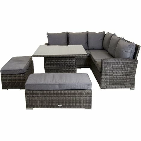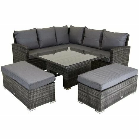 Relax outdoors in luxurious comfort with our contemporary rattan lounge set, perfect for adding a stylish touch to any garden or patio. A perfect set for four to eight people, this set comprises of a large corner sofa, 2 large stools and cushions for added support. This set also features a large table with an adjustable height perfect for a relaxed dining experience. Made from a flat weave variegated rattan which is weatherproof, this durable Rattan set can withstand harsh elements.