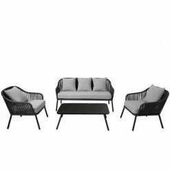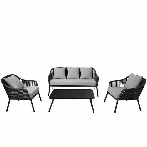 This stylish Charles Bentley Rope and Metal Lounge Set would look perfect in any outdoor or indoor dining space, Ideal for relaxing in your garden or conservatory. This set includes 1 x 2 seater sofa, 2 x single seater chairs, both crafted from Aluminium frame and Textilene rope with an extra thick 10cm grey cushion for added comfort and a stylish black steel coffee table.