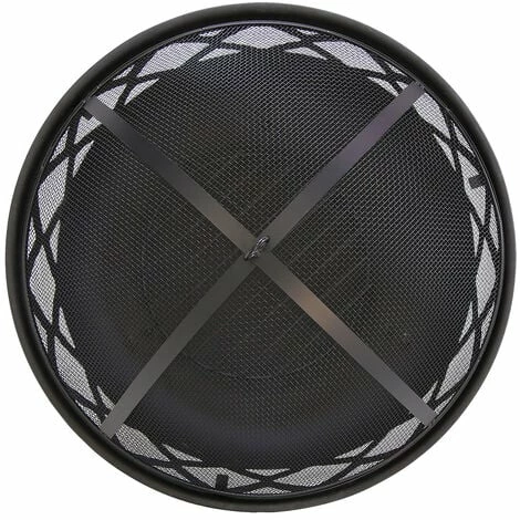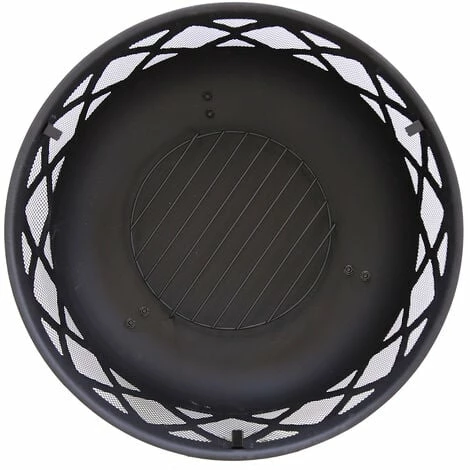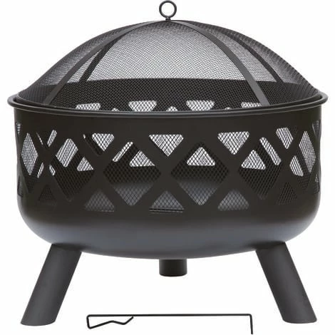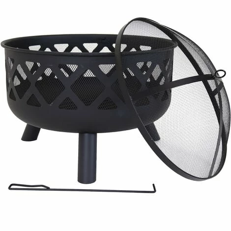 Crafted in a stylish round shape with three sturdy metal legs, this modern black fire pit features a timeless lattice design around the edge of the fire pit. Perfect for adding extra warmth and light when you want to sit outside on those crisper nights, this fire pit is a practical garden accessory. Suitable for burning both wood and charcoal, this fire pit comes with both a safety tool and mesh cover, preventing debris from escaping. A log grate is also included. With a heatproof painted finish, this fire pit can withstand very high temperatures. Constructed from durable steel, it will last for many years to come.