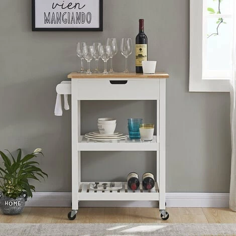 Our Charles Bentley kitchen trolley is perfect for those looking to add extra workspace in their kitchen. This piece includes a tea towel rail, large storage drawer, two tiers of shelving, and a stylish rubber wood top. What’s more, this piece has wheels for easy movement, allowing you to create additional space and storage wherever it is needed. Also available in black and grey.
