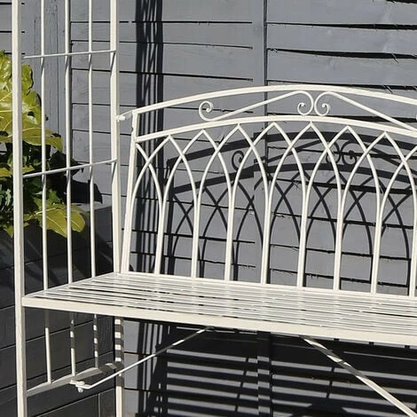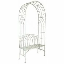 This lovely Charles Bentley Wrought Iron Arch with Bench is ideal for comfortably seating 2 people. It will look amazing in any size garden, on a lawn, decking or patio area. This wrought iron arch with bench is ideal for seating two people and the classic decorative arch is perfect for growing climbing plants or clematis. It is painted in white rust proof paint with a brushed finish, giving it an antique feel.